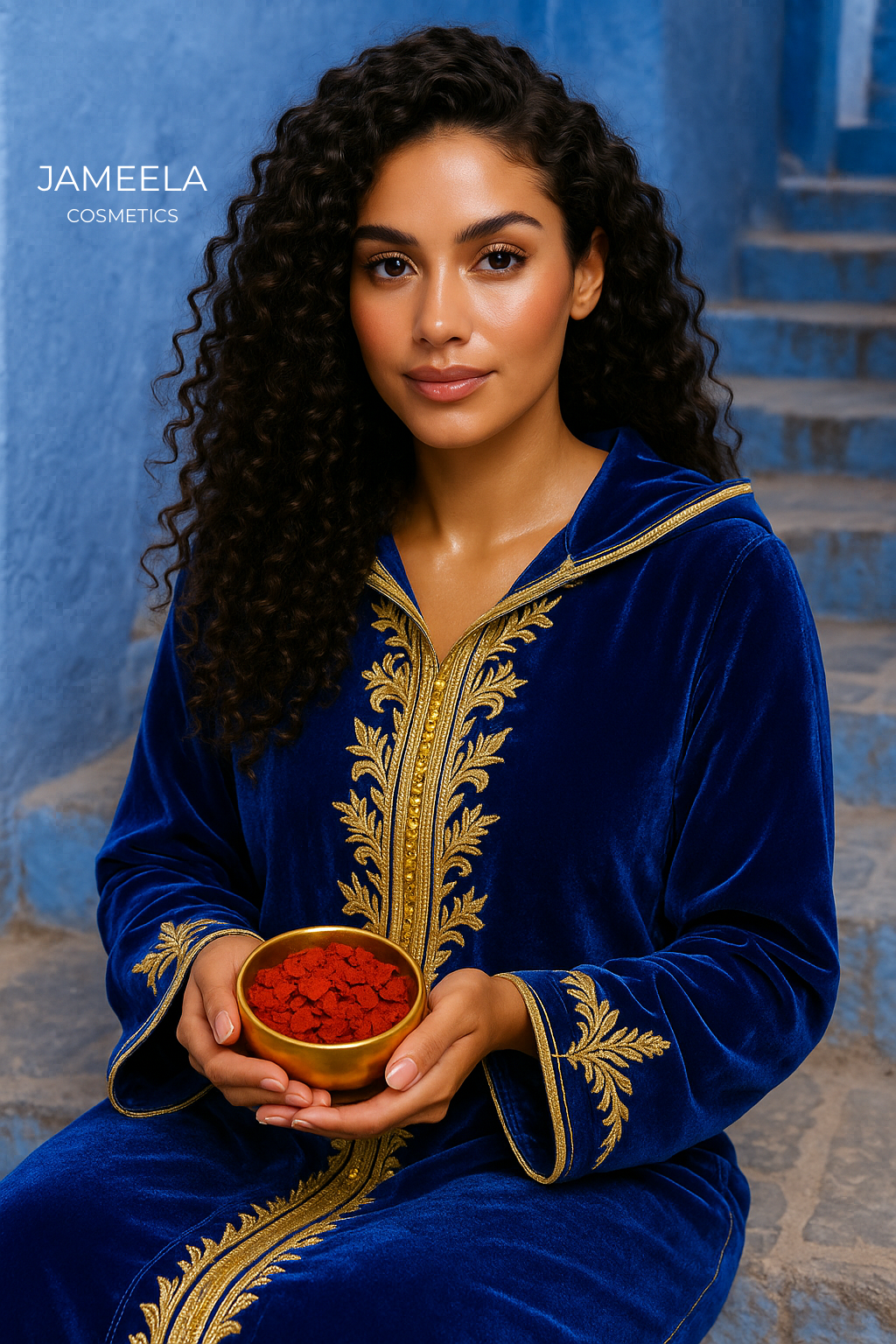 Our Aker Fassi Loose is 100% pure — made from sun dried poppy petals and pomegranate peel, just as Moroccan women have done for centuries. This vibrant red powder is known for its ability to boost natural radiance, improve skin tone, and support anti-ageing and collagen production.